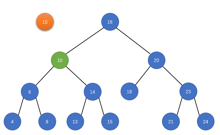 来到新的树的根节点位置,发现当前节点13依然小于15,又一次前往当前节点的右子树。