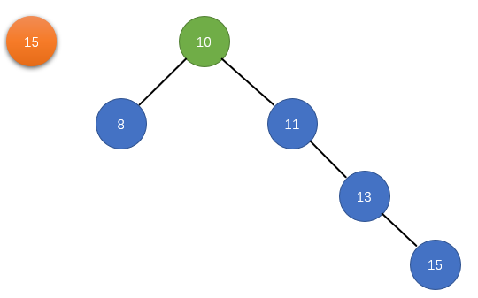 此时来到右子树,发现根节点是11,15>11,那么再次前往当前节点的右子树中寻找。