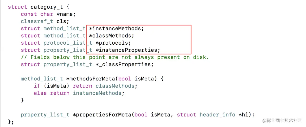 - Category 编译之后的底层结构是 struct category_t 结构体,里面存储着分类的对象方法、类方法、属性、协议信息.