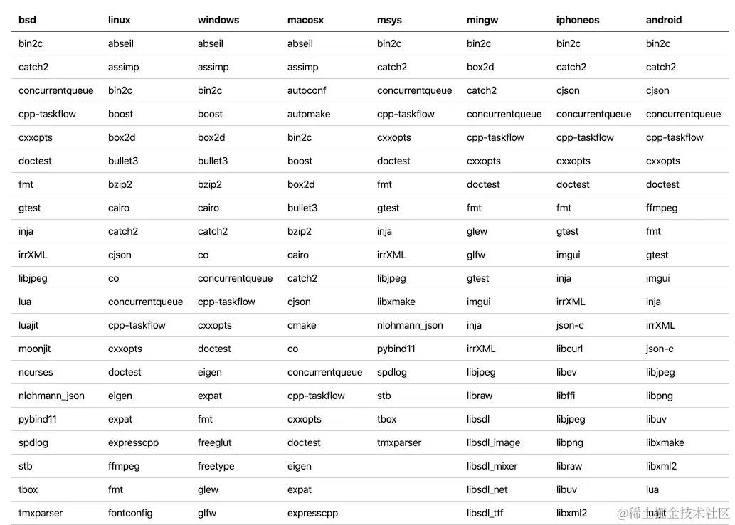 而最近 xmake-repo 官方 C/C++ 包仓库中,我们也新增收入了不少支持 mingw 平台的新库,可直接使用。