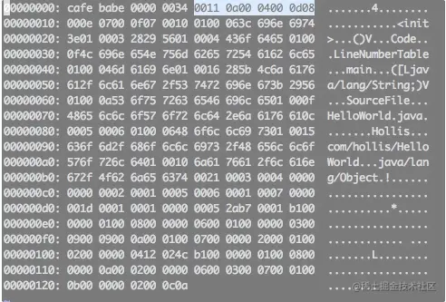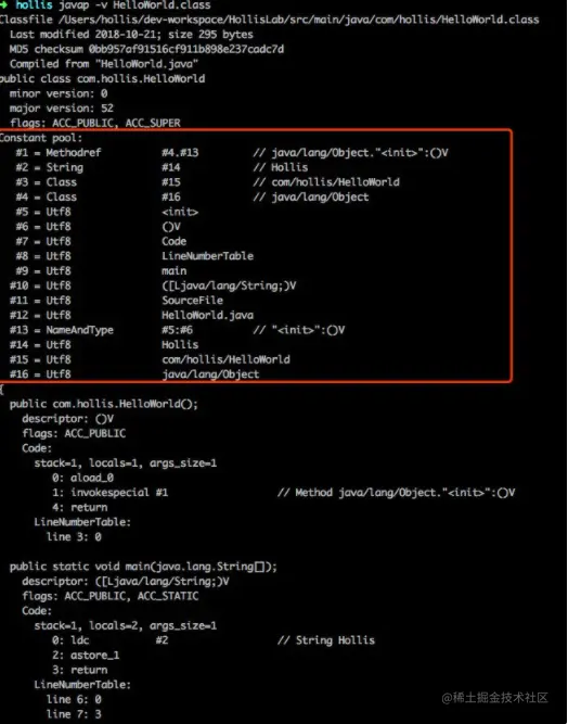 这也就可以印证前面的常量池中还包含一些com/hollis/HelloWorld、main、([Ljava/lang/String;)V等常量的原因了。