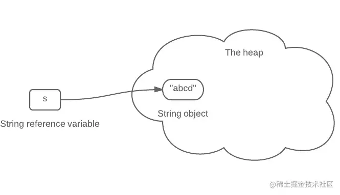 s中保存了string对象的引用。下面的箭头可以理解为“存储他的引用”。