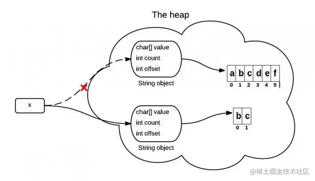 上面提到的问题,在jdk 7中得到解决。在jdk 7 中,substring方法会在堆内存中创建一个新的数组。