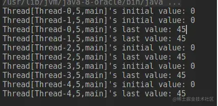 上面的例子,threadLocal是每线程独有的,所以就算进行累加后,彼此的值也是互不影响的,最后输出如下:
