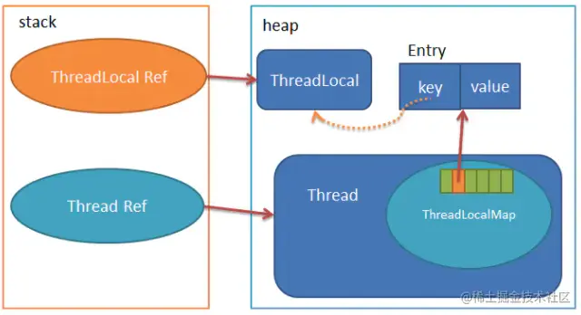 这里ThreadLocal和key之间的线是虚线,因为Entry是继承了WeakReference实现的,当ThreadLocal Ref销毁时,指向堆中ThreadLocal实例的唯一一条强引用消失了,只有Entry有一条指向ThreadLocal实例的弱引用,假设你知道弱引用的特性,那么这里ThreadLocal实例是可以被GC掉的。这时Entry里的key为null了,那么直到线程结束前,Entry中的value都是无法回收的,这里可能产生内存泄露,后面会说如何解决。