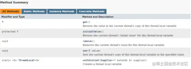 查看官方文档,可知ThreadLocal包含以下方法: