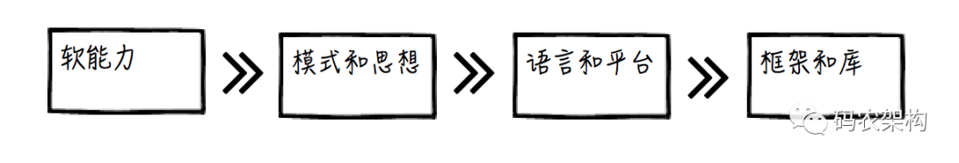 我们都听过“技术无贵贱”的说法,但这并不代表我们要“无区别”地学习技术。工程师,说白了最重要的就是“工程能力”,就是应用工程化的思想和技术,去解决实际的问题。我把工程能力粗略地分成这样四个级别,请注意,它们都必不可少,这个分级也不严密,但是我们能从中看到一个大致的趋势: