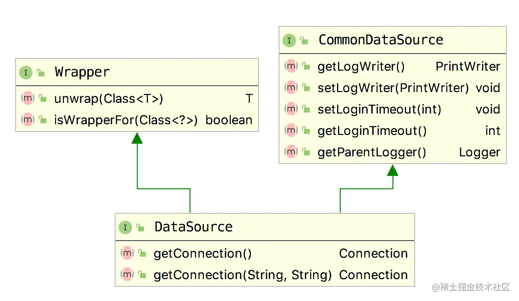 - Wrapper:当前DataSource如果是代理实现,提供获取目标实例的能力。unwrap获取目标实例,isWrapperFor判断能否获取指定Class的目标实例。