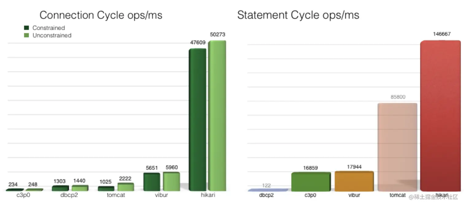 HikariCP包含许多微优化,这些优化几乎无法单独衡量,但结合起来可以提高整体性能。 这些优化中的一些优化以毫秒为单位的几百万分摊。