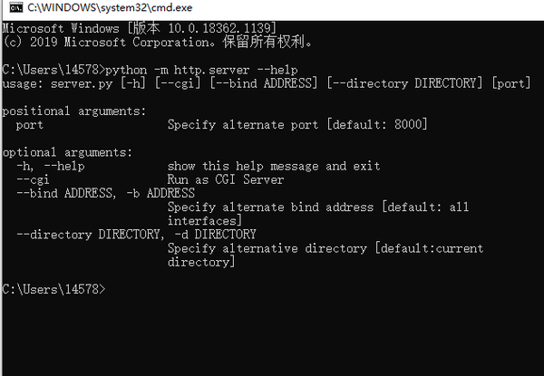 它会创建和侦听 HTTP 套接字,并将请求调度给处理程序。在Python3.7中,http.server提供了5种参数,调用下面帮助命令可显示如下:
