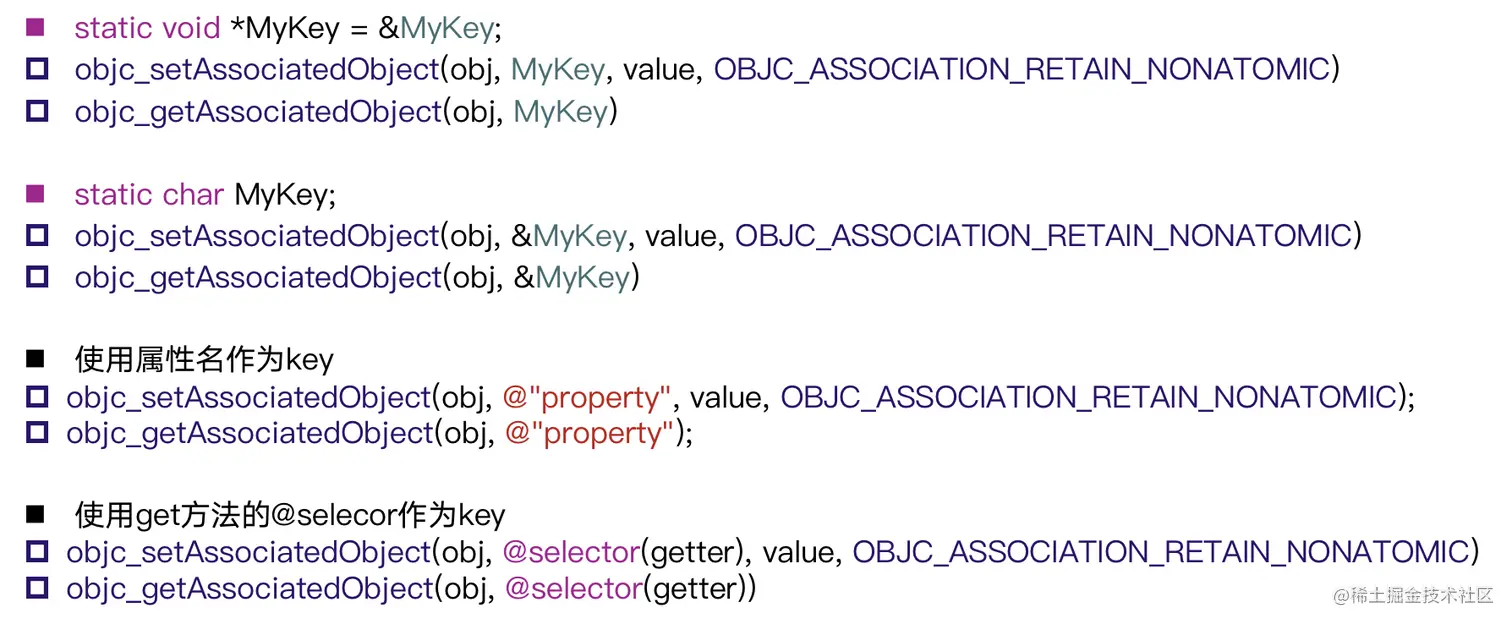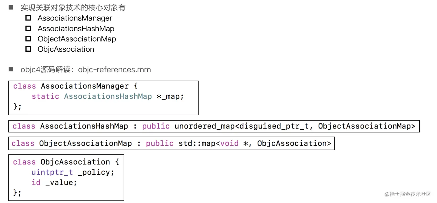 - 设置关联对象的原理,是系统通过 AssociationsManager 管理多个hash map,通过 object_set_associative 设置相应的 key 和 value存储到 hash map 中,在取出的时候再通过对应的 key 取出对应的 value。