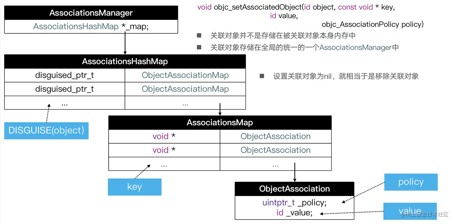 void objc_setAssociatedObject(id object, const void * key,id value, objc_AssociationPolicy policy)为例,首先会通过AssociationsManager获取AssociationsHashMap,然后以object的内存地址为key,从AssociationsHashMap中取出ObjectAssociationMap,若没有,则新创建一个ObjectAssociationMap,然后通过key获取旧值,以及通过key和policy生成新值ObjcAssociation(policy, new_value),把新值存放到ObjectAssociationMap中,若新值不为nil,并且内存管理策略为retain,则会对新值进行一次retain,若新值为nil,则会删除旧值,若旧值不为空并且内存管理的策略是retain,则对旧值进行一次release