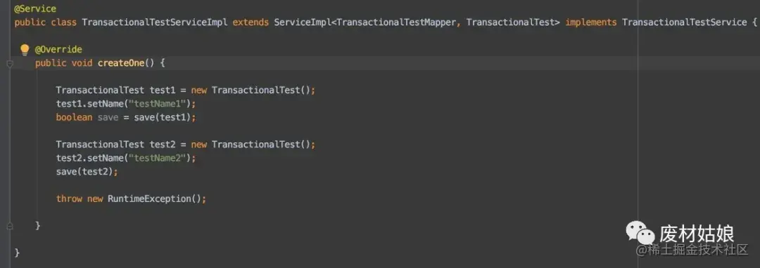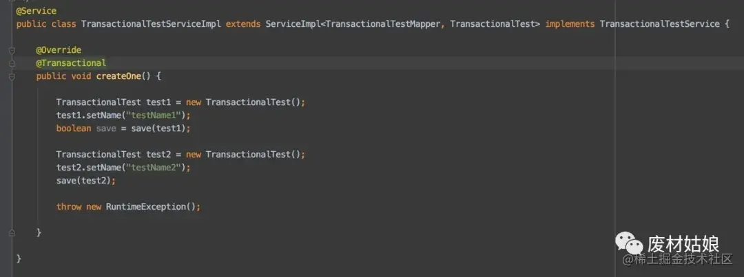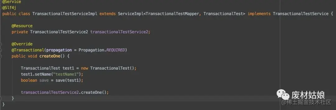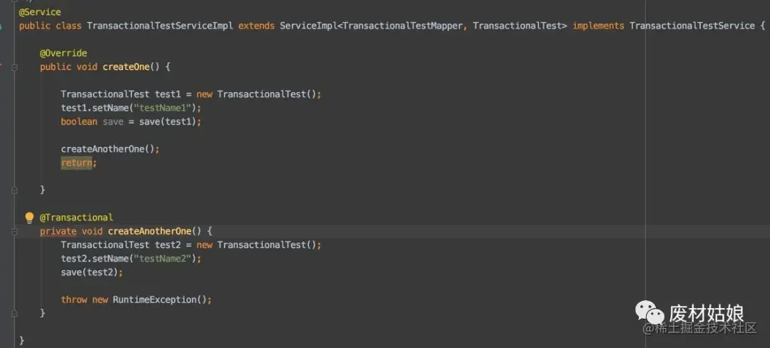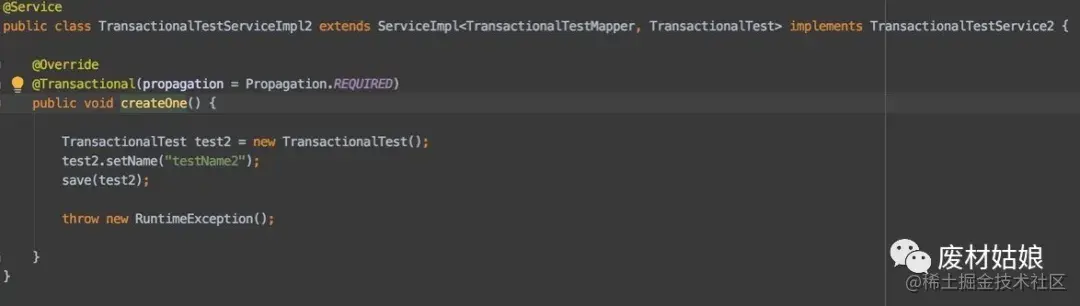原来@Transactional 注解是基于代理来的, 都知道AOP是代理,所以在实际中是创建了service代理, 并在方法运行前开启事务,运行后提交事务。而我的第二个方法是我service内部的, 不会再有更多的代理了。自然事务也就不好用了。 这下我们知道了,要想使用@Transactional注解,还是要放在service的入口方法,像我们刚刚的需求,就要再创建一个新的service了。于是代码变成这样: