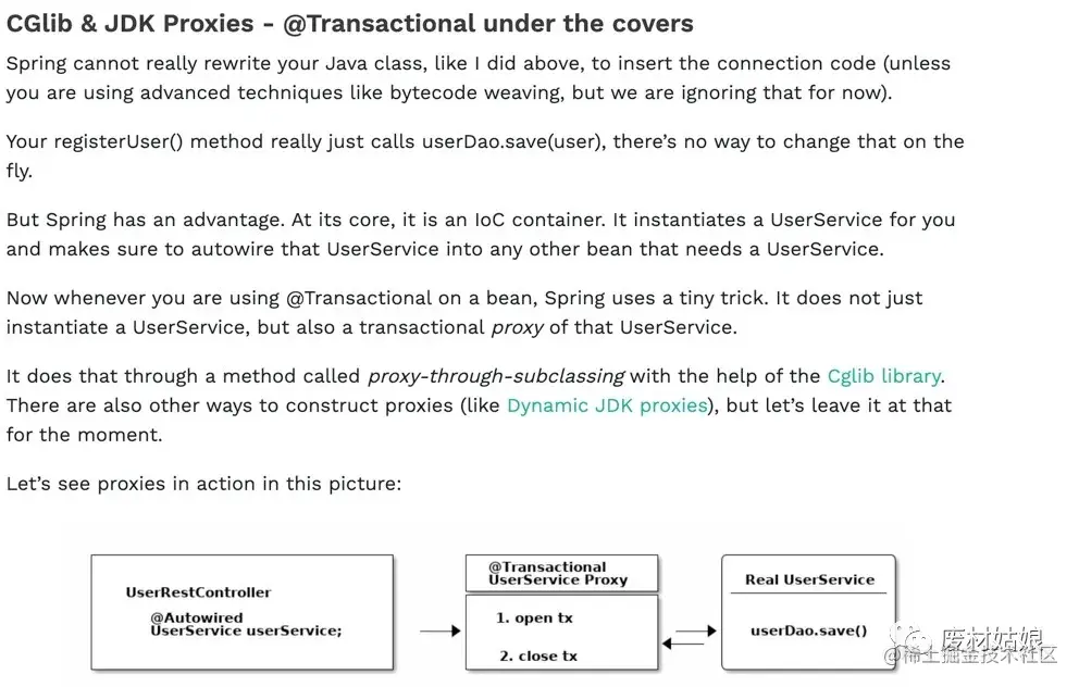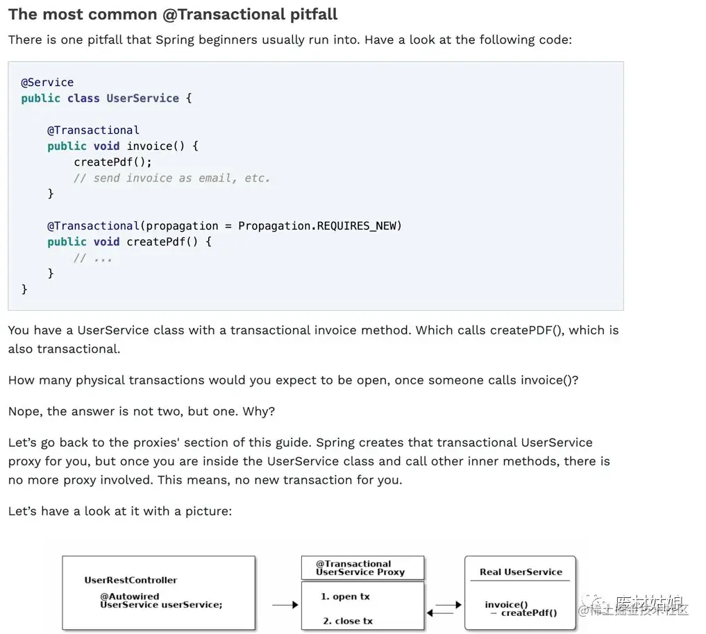 哎, 为啥我两条数据都插进去了, 没有回滚啊。这个时候你就不得不借助理论知识了, 不管你是度娘也好, 谷爹也好, 书也好, 去找吧,我就找到下面这篇文章:www.marcobehler.com/guides/spri… 他解析了事务的的原理, 并提示你有陷阱: