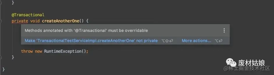 此时我发现, 编译器给我提示了一个错误, 点开看看,这是不让我用private呀, 还说使用@Transactional必须要是overridable的, 这是心理就犯嘀咕了, 为什么, 为啥啊???? 哎呀, 下不管了, 既然不让我用private, 我就所性改成public的试试。果然不提示错误了,运行吧。