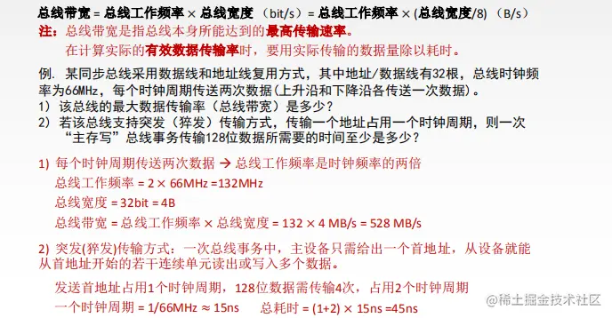 计算机组成原理笔记——总线性能指标(带宽) _hero 2020-10-18 233 阅读1分钟 两个概念 1.总线周期。指一次总线操作所需要的时间(包括申请阶段、寻址阶段、传输阶段、结束阶段) 2.总线时钟周期。即机器的时钟周期 区别 1.大多数情况下,一个总线周期包含多个总线时钟周期 2.有的时候,一个总线周期等于一个总线时钟周期 3.有的时候,一个总线时钟周期包含多个总线周期(如一个总线时钟周期的上升沿可以传送一次数据,下降沿也可以传送一次数据) 有关的一道计算题 本题中,一个总线时钟周期包含两个总线周期,注意理解突发(猝发)传输方式