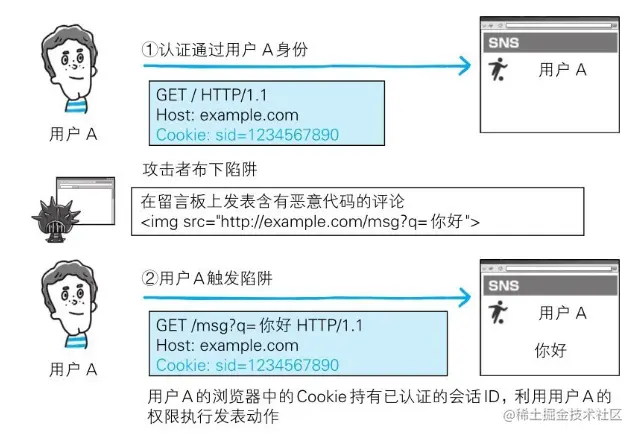 攻击者设置好一旦用户访问,即会发送在留言板上发表非主观行为产生的评论的请求的陷阱。用户A的浏览器执行完陷阱中的请求后,留言板上也就会留下那条评论