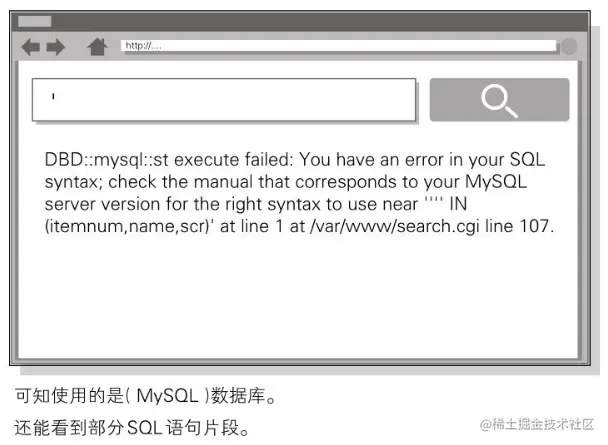 上方的画面中显示了与SQL有关的错误信息。对开发者而言,该信息或许在Debug时会有帮助,但对用户毫无用处。攻击者从这条消息中可读出数据库选用的是MySQL,甚至还看见了SQL语句的片段。这可能给攻击者进行SQL注入攻击以启发。