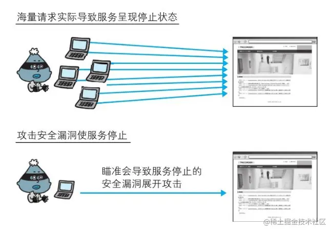 其中,集中利用访问请求的DoS攻击,单纯来讲就是发送大量的合法请求。服务器很难分辨何为正常请求,何为攻击请求,因此很难防止DoS攻击。