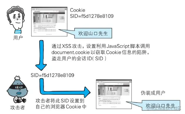 攻击者在得知该Web网站存在可跨站攻击(XSS)的安全漏洞后,就设置好用JavaScript脚本调用document.cookie以窃取Cookie信息的陷阱,一旦用户踏入陷阱(访问了该脚本),攻击者就能获取含有会话ID的Cookie。