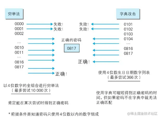 还是举银行采用个人识别码是“4位数字”的密码的例子,考虑到用户使用自己的生日做密码的可能性较高,于是就可以把生日日期数值化,如将0101~1231保存成字典,进行尝试。与穷举法相比,由于需要尝试的候选密码较少,意味着攻击耗费的时间比较短。但是,如果字典中没有正确的密码,那就无法破解成功。