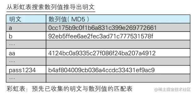 彩虹表(Rainbow Table)是由明文密码及与之对应的散列值构成的一张数据库表,是一种通过事先制作庞大的彩虹表,可在穷举法·字典攻击等实际破解过程中缩短消耗时间的技巧。从彩虹表内搜索散列值就可以推导出对应的明文密码。