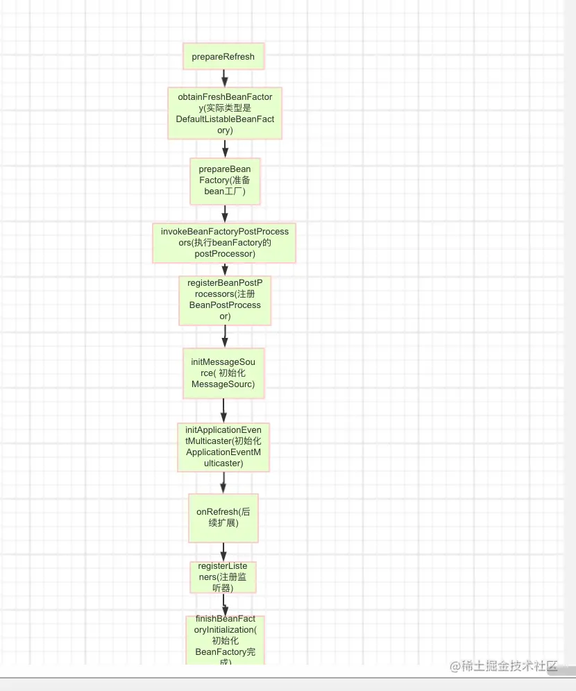 Spring的ApplicationContext的刷新流程,总共是以下图中的十个步骤, 接下来会对每一个步骤进行的详细介绍.