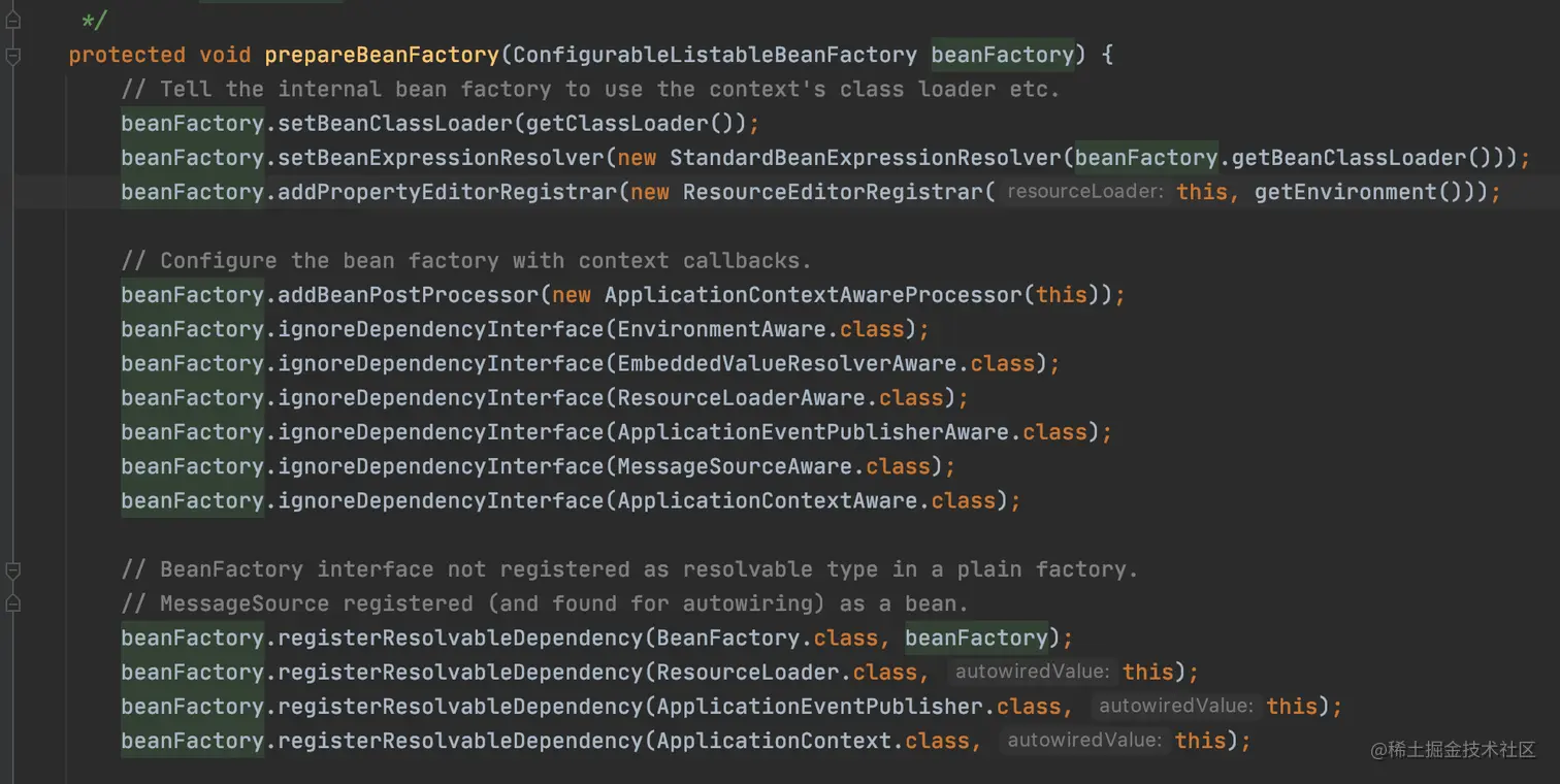 - 设置可以忽略的依赖接口 EnvironmentAware,EmbeddedValueResolverAware,ResourceLoaderAware, ApplicationEventPublisherAware,MessageSourceAware,ApplicationContextAware, 这六个接口是依赖是可以跳过这个set的注入依赖的.因为这6个是Aware的回调的依赖.