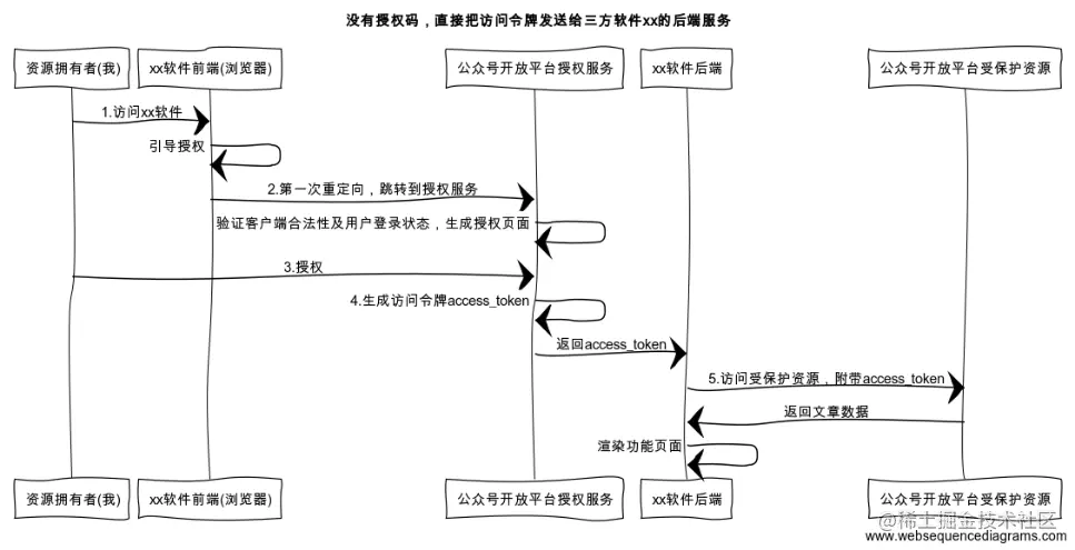 第 4 步授权服务生成授权码,倘若我们不要授权码,这步直接返回访问令牌access_token 。那就不能重定向,因为这样会把安全保密性要求极高的访问令牌暴露在浏览器,增加访问令牌失窃风险。这显然不行的呀!即若无授权码,就只能把访问令牌发给第三方软件的后端服务: