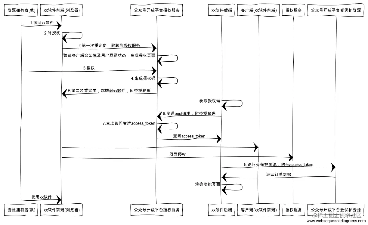 我:“xx,我要访问你了。” xx:“我把你引到授权服务,我需要授权服务给我一个授权码。” 授权服务:“xx,我把授权码发给浏览器了。” 小兔软件:“ 那我从浏览器拿到了授权码。”