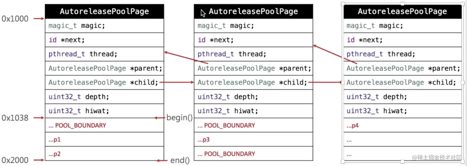 - 内部是个 双向链表 的结构,每一个都是一个 AutoreleasePoolPage 进行相连,以 child 和 parent 指针进行相连。