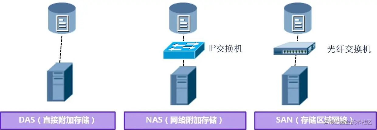 特征:磁盘装在服务器内部,直连服务器的串行(SCSI)接口。(类似笔记本通过USB直接插入移动硬盘)