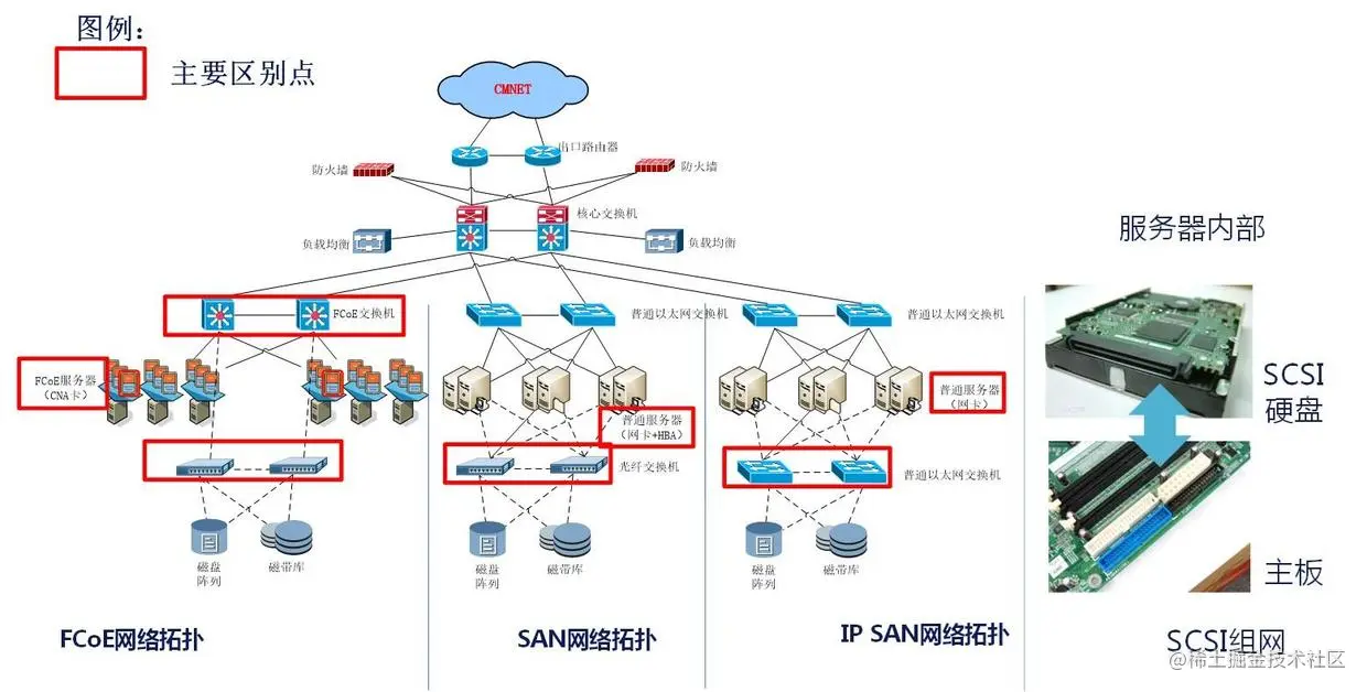 对应SAN网络存储,但IP交换机采用具备FCoE功能的交换机,数据通过FC协议进行封装,外层再封装IP协议,再通过IP网络传输。