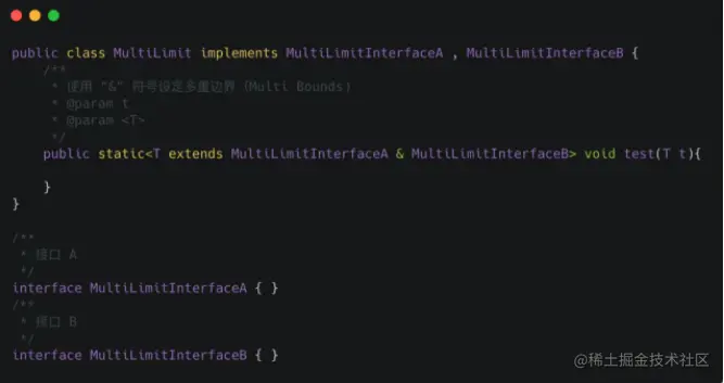 使用 & 符号设定多重边界(Multi Bounds),指定泛型类型 T 必须是 MultiLimitInterfaceA 和 MultiLimitInterfaceB 的共有子类型,此时变量 t 就具有了所有限定的方法和属性。对于通配符来说,因为它不是一个确定的类型,所以不能进行多重限定。