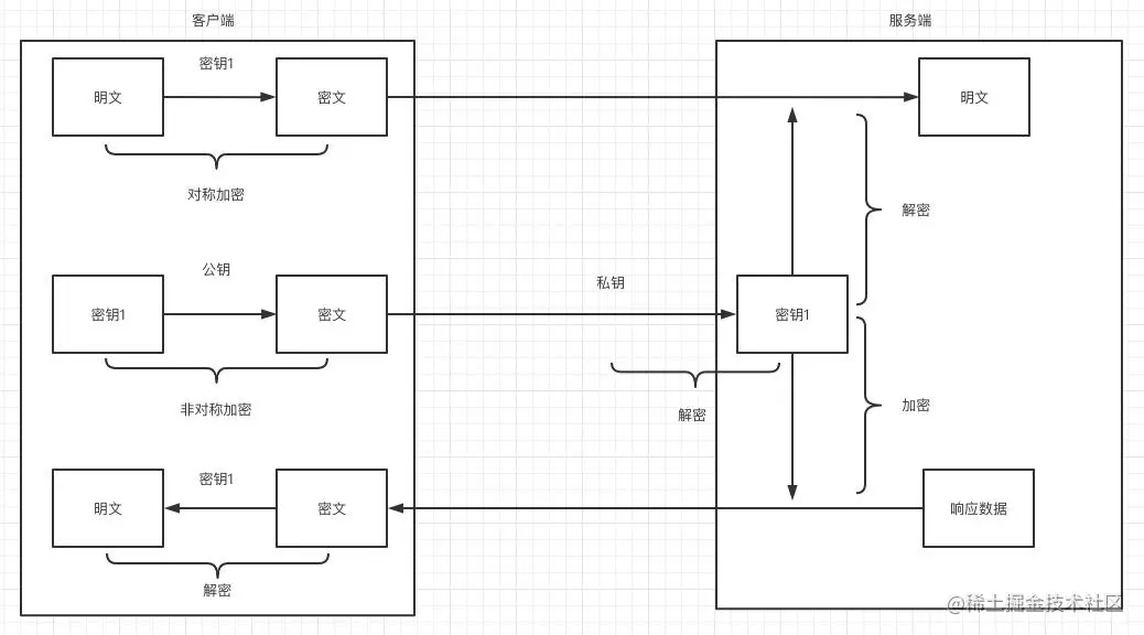 方案三:如果把对称加密和非对称加密相结合。客户端需要生成一个对称加密的密钥 1,传输内容与该密钥 1进行对称加密传给服务端,并且把密钥 1 和公钥进行非对称加密,然后也传给服务端。服务端通过私钥把对称加密的密钥 1 解密出来,然后通过该密钥 1 解密出内容。以上是客户端到服务端的过程。如果是服务端要发数据到客户端,就需要把响应数据跟对称加密的密钥 1 进行加密,然后客户端接收到密文,通过客户端的密钥 1进行解密,从而完成加密传输。