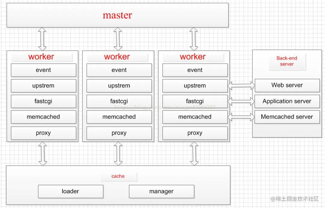 Nginx 在启动后,会有一个 Master 进程和多个 Worker 进程,Master 进程和 Worker 进程之间是通过进程间通信进行交互的,如图所示。Worker 工作进程的阻塞点是在像 select()、epoll_wait() 等这样的 I/O 多路复用函数调用处,以等待发生数据可读 / 写事件。Nginx 采用了异步非阻塞的方式来处理请求,也就是说,Nginx 是可以同时处理成千上万个请求的。一个 Worker 进程可以同时处理的请求数只受限于内存大小,而且在架构设计上,不同的 Worker 进程之间处理并发请求时几乎没有同步锁的限制,Worker 进程通常不会进入睡眠状态,因此,当 Nginx 上的进程数与 CPU 核心数相等时(最好每一个 Worker 进程都绑定特定的 CPU 核心),进程间切换的代价是最小的。