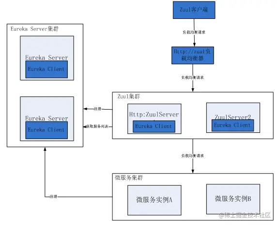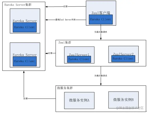 如图所示,Zuul 客户端将请求发送到负载均衡器,负载均衡器将请求转发到其代理的其中一个 Zuul 节点,这样就可以实现 Zuul 的高可用。