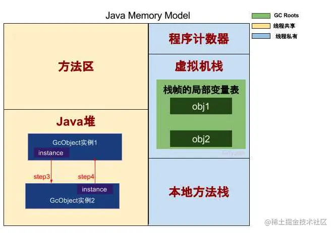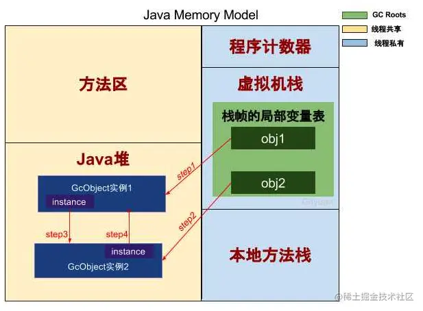 Step5:栈帧中obj1不再指向Java堆,GcObject实例1的引用计数减1,结果为1; Step6:栈帧中obj2不再指向Java堆,GcObject实例2的引用计数减1,结果为1。