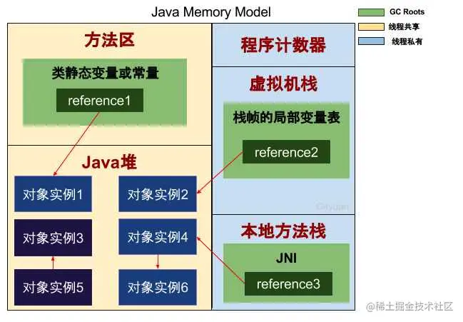 可以得出对象实例1、2、4、6都具有GC Roots可达性,也就是存活对象,不能被GC回收的对象。