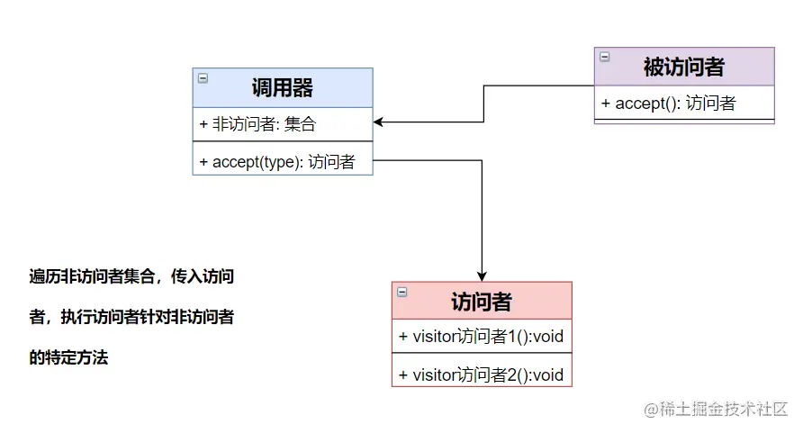 访问者设计模式的思想:「所有可以被访问的对象,都会声明一个accept方法,用来定义哪些访问者可以访问这个对象 ,所有的访问者对象都自己实现一套访问这些对象的方法。当访问者进行访问的时候,调用器调用accept方法,这个时候会通过遍历的方式,调用每一个可以被访问对象的accept方法,进而调用访问者对象定义的对这个对象的访问方法。」
