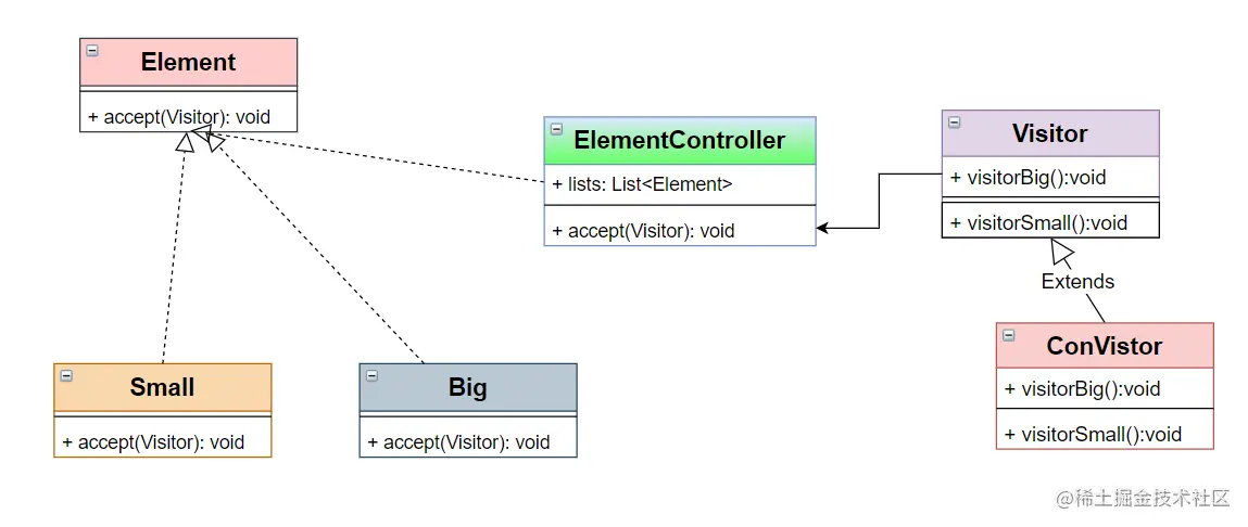 accept方法,实现元素对象。Small,Big - 控制器。用来控制增加或者删除可以被访问对象和具体的访问者访问被访问者,实现元素对象。(