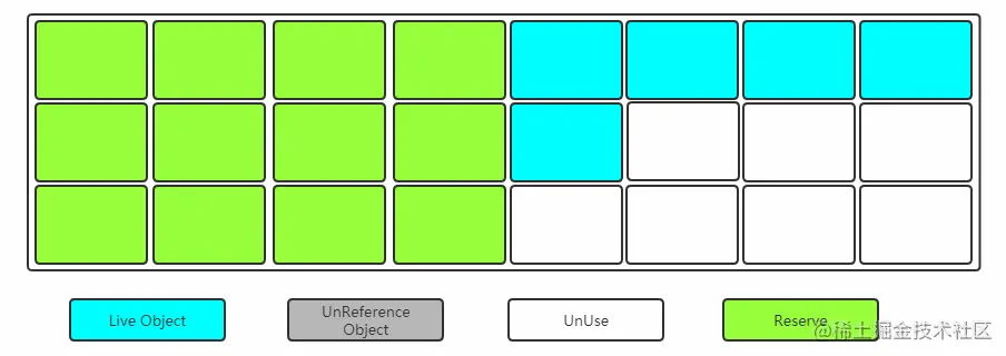 标记过程仍然与"标记-清除"算法一样,但是后续步骤不是直接对可回收对象进行清理,而是让所有存活的对象都向一端移动,然后直接清理掉端边界以外的内存