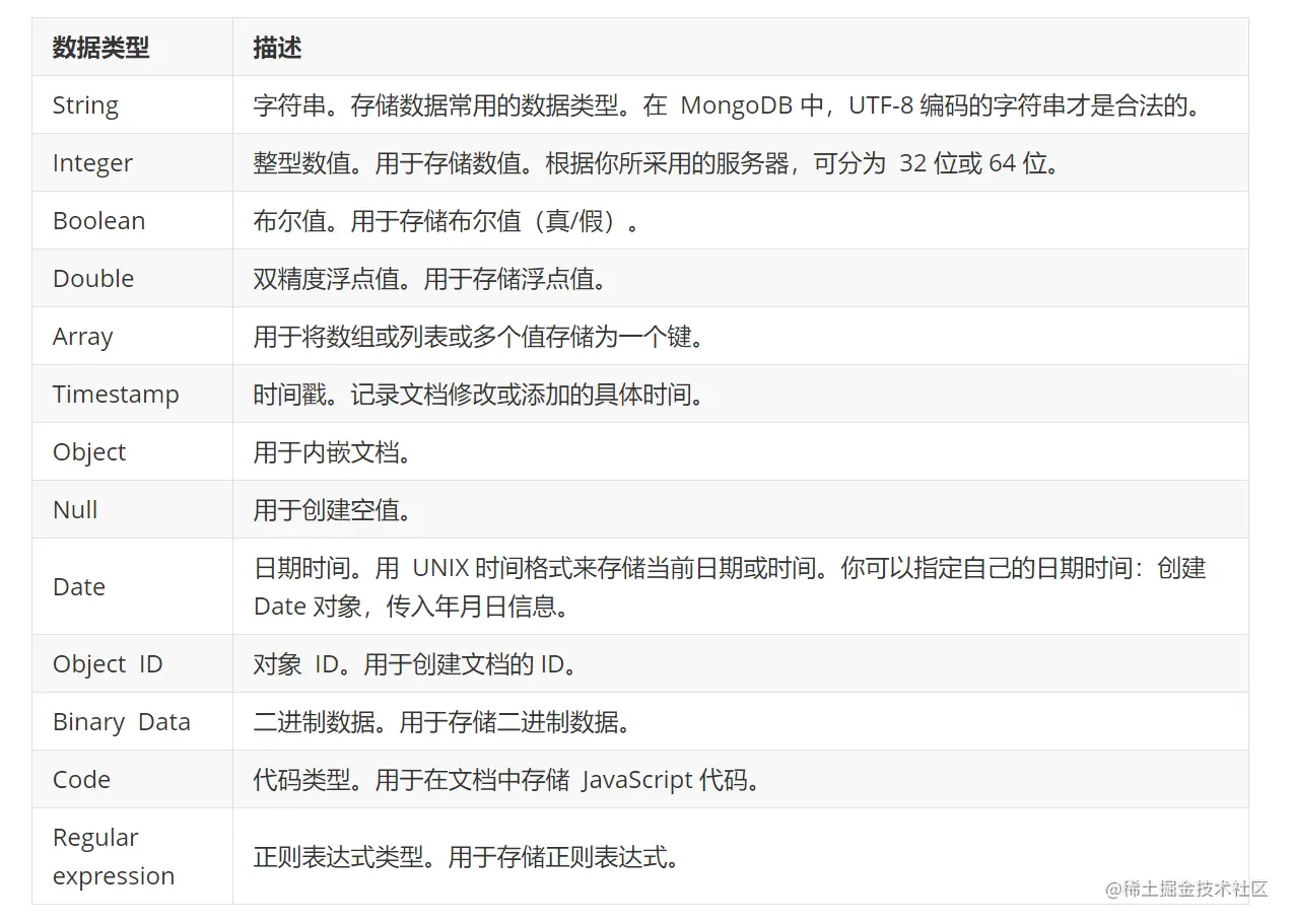 - MongoDB 的文档(document),相当于关系数据库中的一行记录。