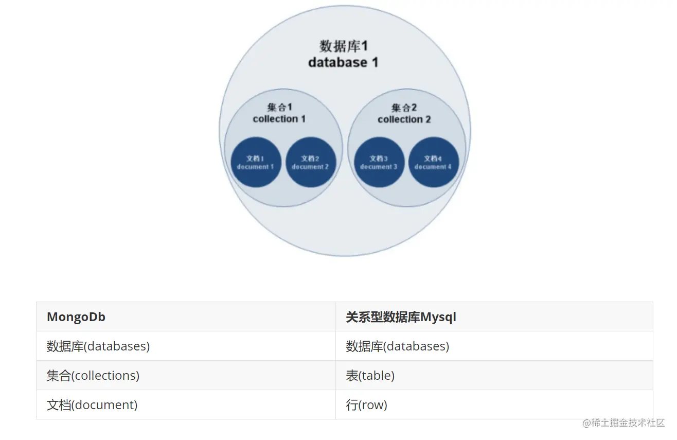 - 多个文档组成一个集合(collection),相当于关系数据库的表。