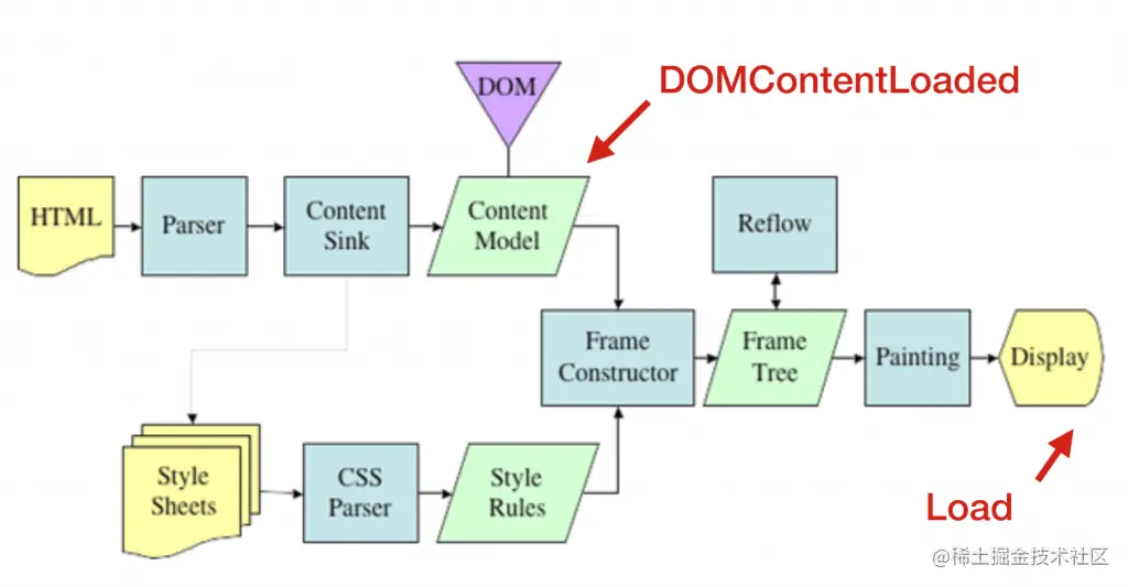 下面是一张浏览器渲染的过程图,我们刚刚介绍的两个事件,分别位于下图的箭头位置