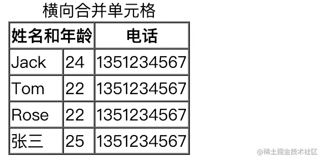 那么有此图可以看出。原来表格中第一行中姓名、年龄这两个单元格,我们要对他们横向合并成一个单元格,才能实现我们的效果。