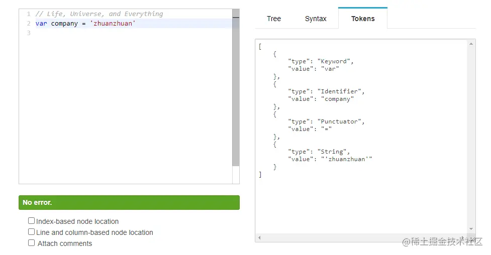 它继续向下找发现了一个字母 'company'(因为找到的上一个值是 "var" 这个时候如果它发现下一个字符不是字母可能直接就会报错返回)并且后面是空格,生成{ "type" : "Identifier" , "value" : "company" }放到数组中。