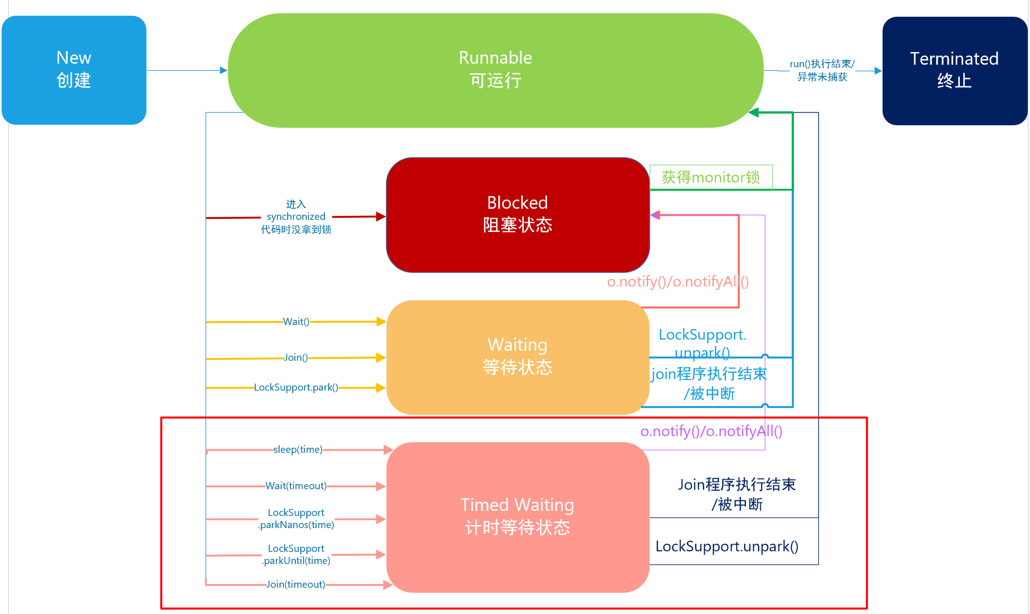 Timed Waiting中执行notify()和notifyAll()也是一样的道理,它们会先进入Blocked状态,然后抢夺锁成功后,再回到Runnable状态。