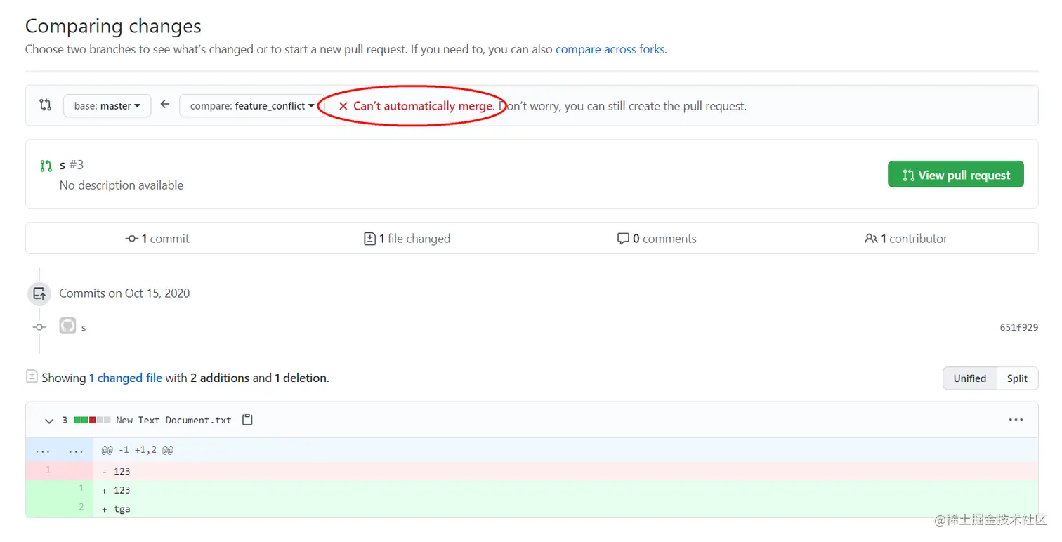 如果各个分支都提交的不同文件,Git 会自动合并。如果提交的有相同文件,就会发生冲突,无法自动合并,Git 也不知道以哪个为准,创建 pull request 会告诉你不能自动 merge